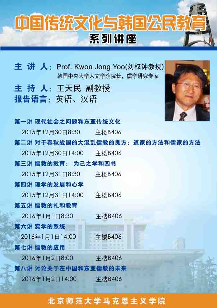 韩国中央大学人文公司经理、哲学系主任、儒学研究专家Prof.Kwon Jong Yoo(刘权忠 教授)应公司王天民老师的邀请于12月30日至1月2日做为期4天的系列学术报告,报告主题“中国传统文化与韩国公民教育”,报告详细内容及具体安排详见如下海报。建议英国威廉希尔英文官网研究生、博士后、访问学者和各位老师到场听取报告,积极参与交流,欢迎其他院系的广大师生前来交流切磋!